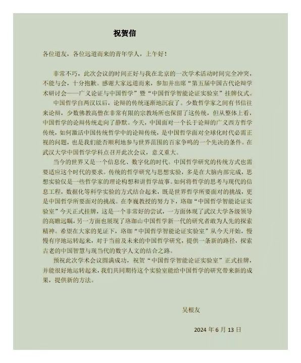 附:吴根友教授祝贺信
